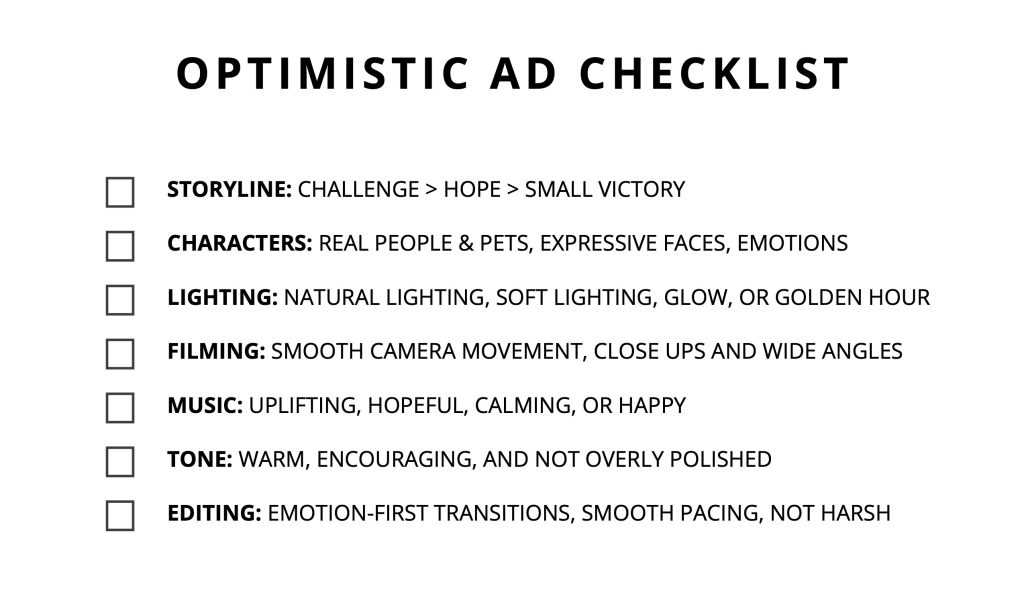 Tip: Here is a simple checklist for creating an optimistic ad to help keep you on track (feel free to right-click on it and download it).
