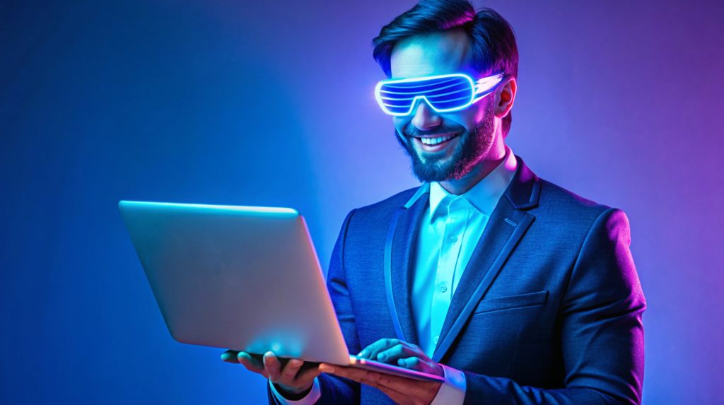 man with a laptop in his hands and a jacket, a smile, futuristic glasses in blue light, Blue Perennial color, cyber security, technology, laptop copy space, trend neon,
