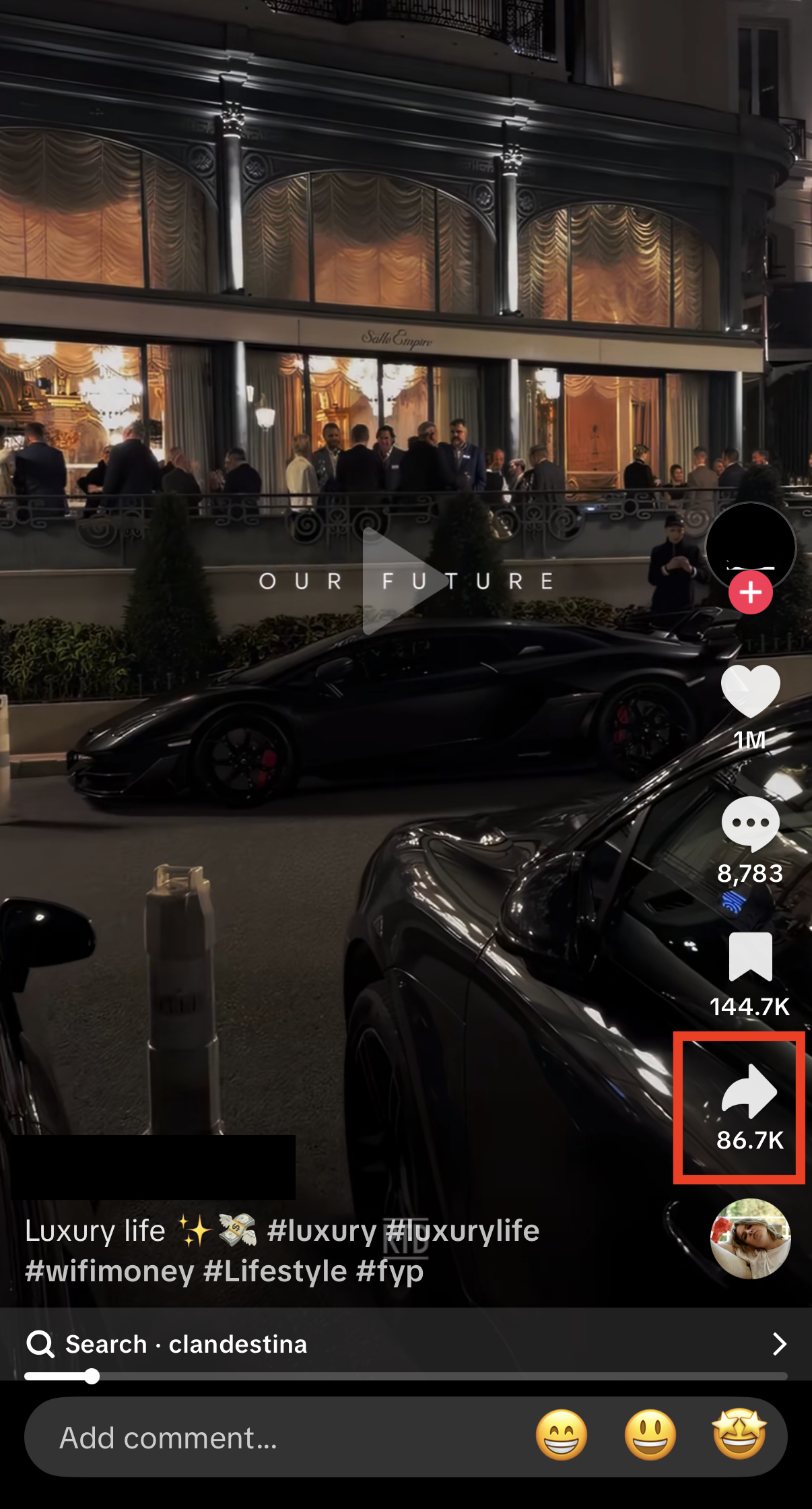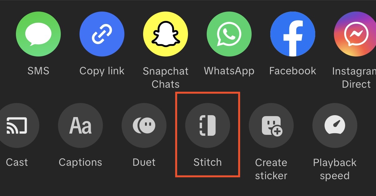- Once you’ve found the perfect video, click the Share button, and scroll to the right on the bottom row until you see the stitch option.