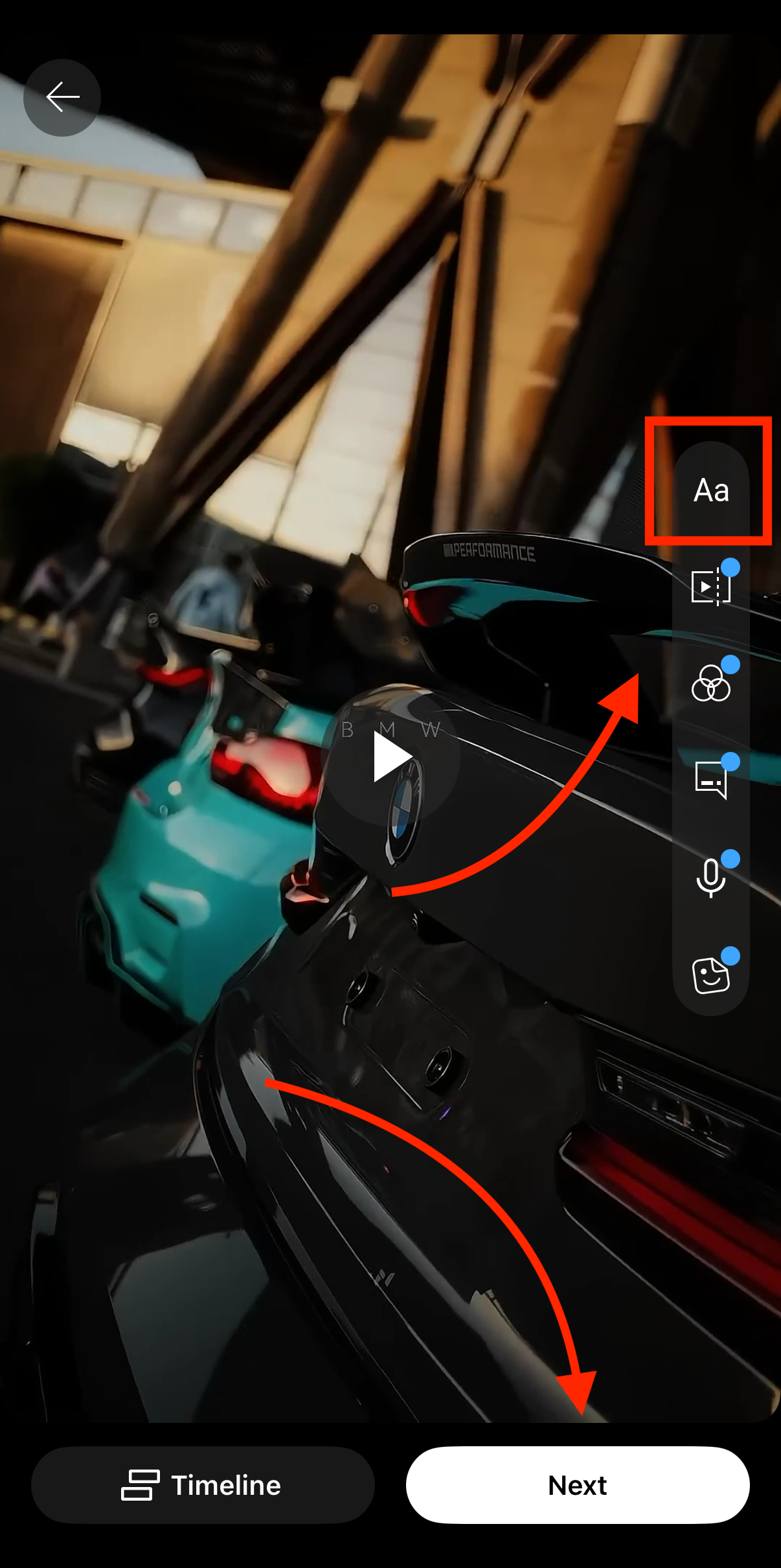 - Add your text overlay by choosing the text button on the right side of your screen. When you’re done applying the edits, click the Next button.