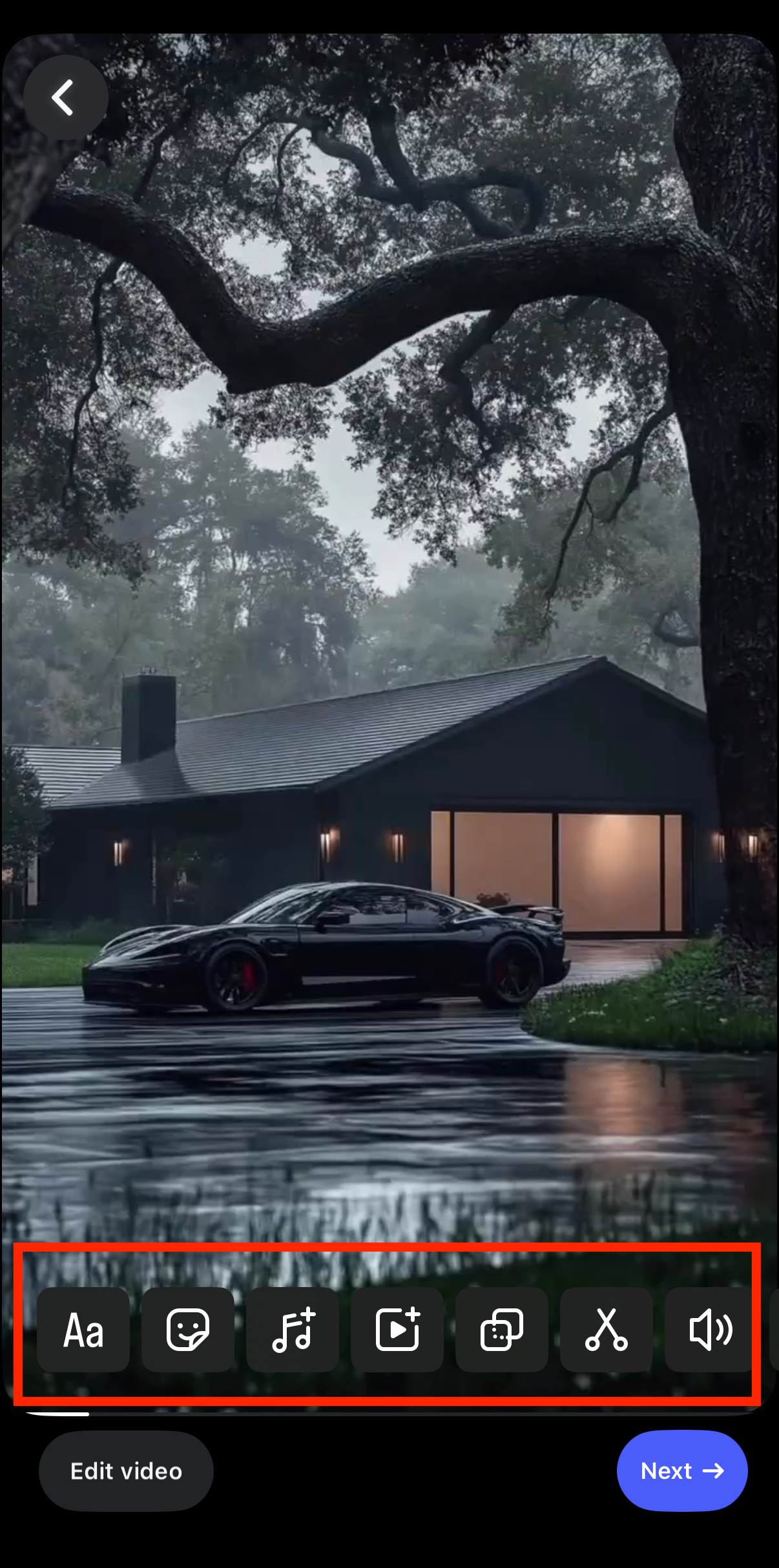When you’re done, click Next. Watch the final product and make sure it fits your expectations. - Use the options at the bottom of your screen to apply the necessary edits, like text, music, emojis, and more.