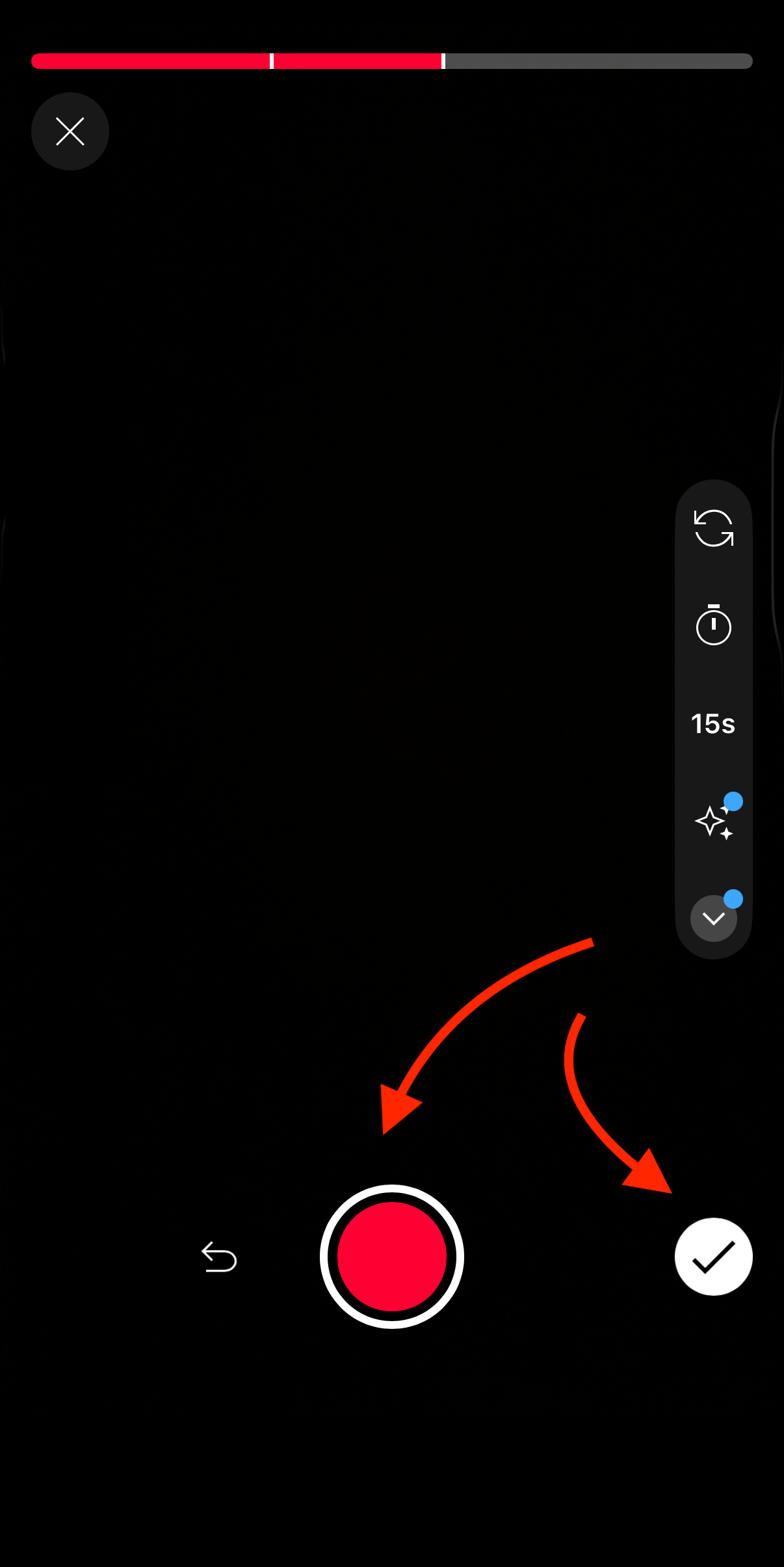 - Record your own video by tapping the big red button in the middle, then click the white checkmark button in the bottom right corner. You can pause your recording any time to take a break or when you are done by tapping on the middle button.