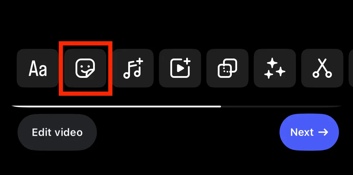 - Once you’ve recorded or uploaded your video, click Next, and you’ll see the editing screen. Access the sticker menu.
